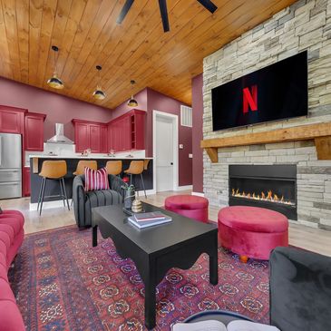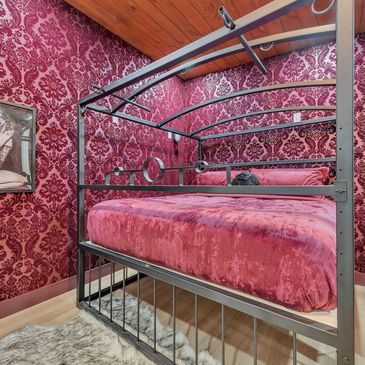 Crimson Hollow features two distinct Red Rooms—each a moody, intimate space where desire meets design. Every inch is thoughtfully crafted with rich textures, ambient lighting, and custom furniture that invites exploration. This adult themed airbnb and kinky cabin experience blends luxury and passion, offering couples a private escape unlike anywhere else in the Smokies.